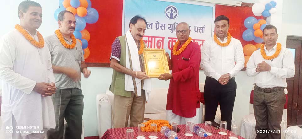 नेपाल प्रेस युनियन पर्साले प्रदेश नं.– २ का उर्जा तथा खानेपानि विकास मन्त्री ओम प्रकाश शर्मालाई आज एक कार्यक्रमका बिच सम्मानित गरेको छ ।